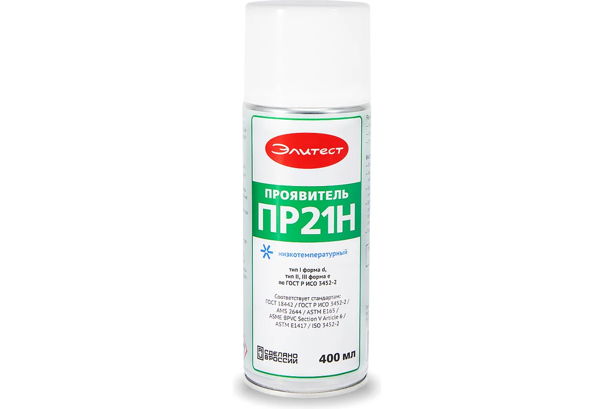 Проявитель Элитест ПР21Н изготавливается на основе растворителей. Создает на контролируемой поверхности однородный белый фон и вытягивает пенетрант, находящийся в полости дефекта. Является полным аналогом стандартного проявителя Элитест ПР21, адаптированным для использования при низких температурах: предельная температура контролируемого изделия может достигать −40 °C.