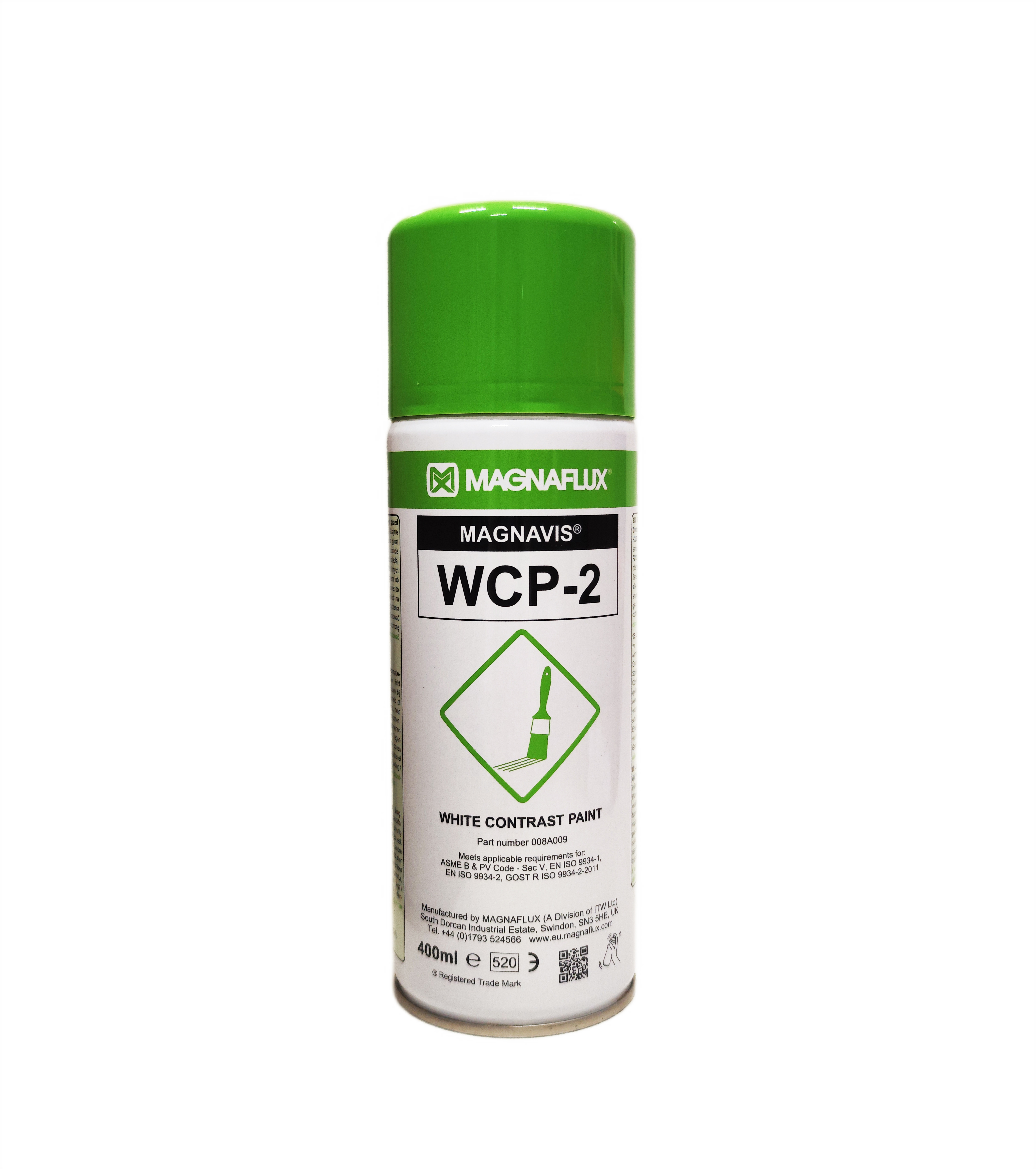 Magnaflux WCP-2 - готовый к использованию, быстро сохнущий белый контрастный краситель, изготовленный на основе ацетона и инертных неорганических пигментов. Обеспечивает белый фон для улучшения осмотра индикаторного рисунка при применении цветоконтрастных магнитных частиц.