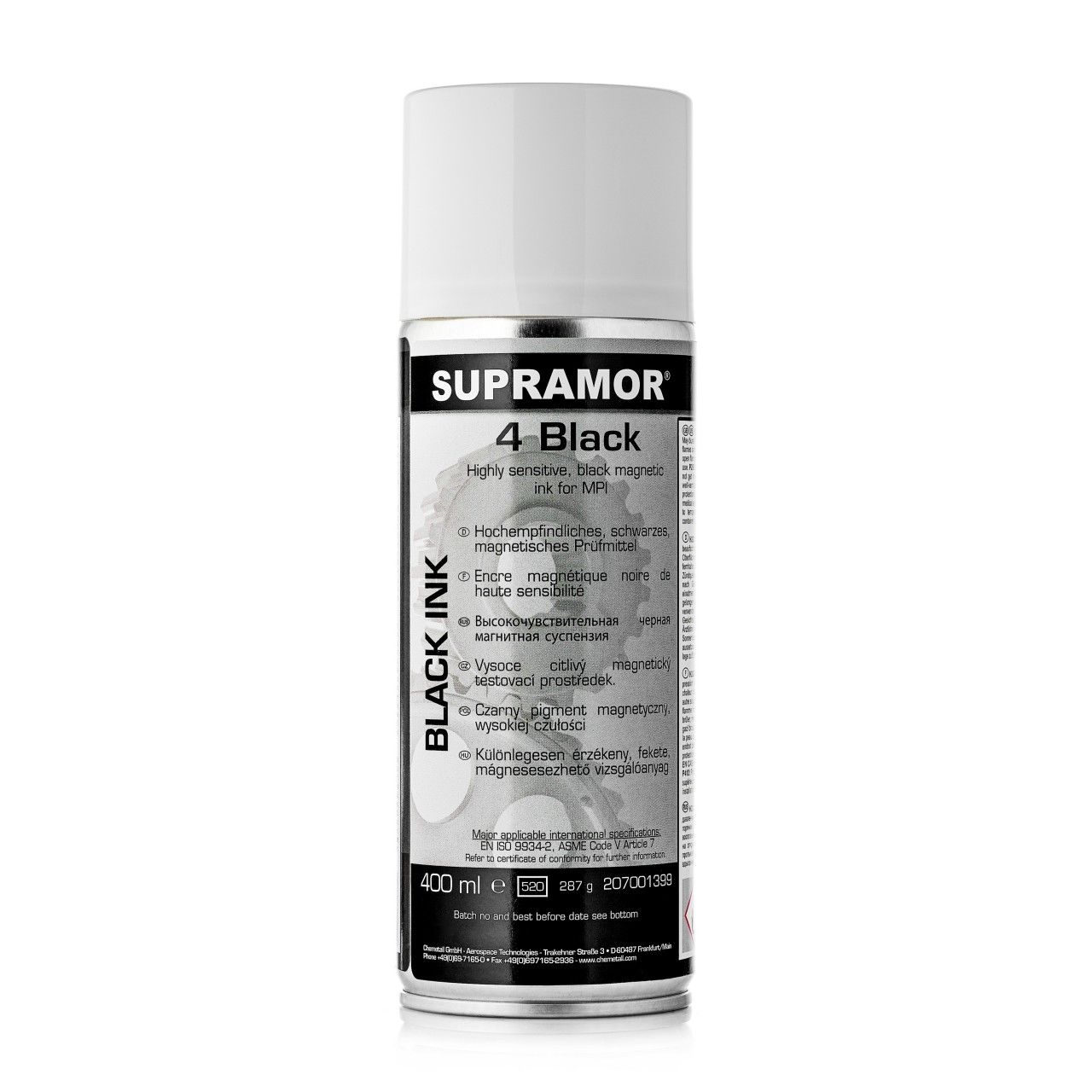 При использовании суспензии поверхностные дефекты ферромагнитных материалов могут быть обнаружены в дневном свете. Продукт соответствует требованиям: EN ISO 9934-2, ASME Boiler & Vessel Code, AMS 3041E, ASTM E 1444-05.