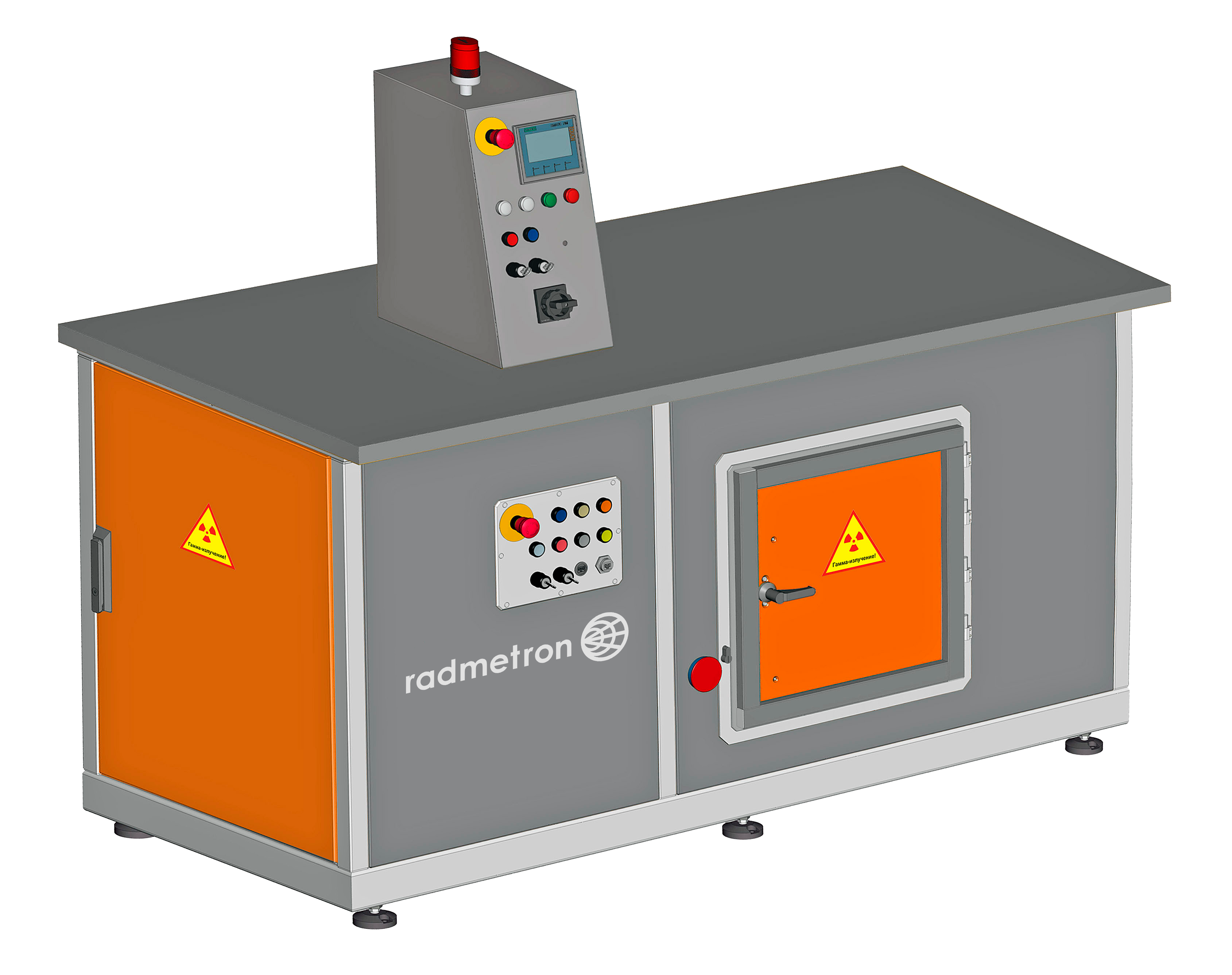• Радиационная безопасность эксплуатации установки обеспечивается системой управления совместно с системой сигнализации и блокировки, а также системой радиационного контроля с одним блоком детектирования гамма-излучения, расположенным в рабочей камере установки.