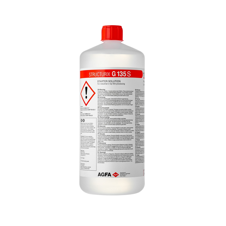 Раствор добавляется в самом начале процесса химико-фотографической обработки рентгенпленки в проявочный бачок машины со свежим раствором проявителя G135 в пропорции 25 мл на 1 л проявителя (или 1 л / 40 л проявителя).