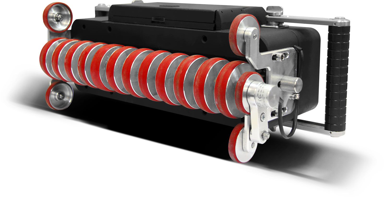 - АР моноблока смонтирована в нижней части прямоугольного корпуса, который снабжён ручками для его удержания. Ручки имеют несколько фиксированных положений, поэтому их можно установить под разными углами к лицевой панели. Все элементы АР имеют независимый подпружиненный подвес и могут перемещаться вдоль своих продольных осей. Это позволит вести контроль не только плоских участков ОК, но и выпуклых с радиусом кривизны от 1400 мм и более, а также и вогнутых с таким же минимальным радиусом. (Рис.3)
